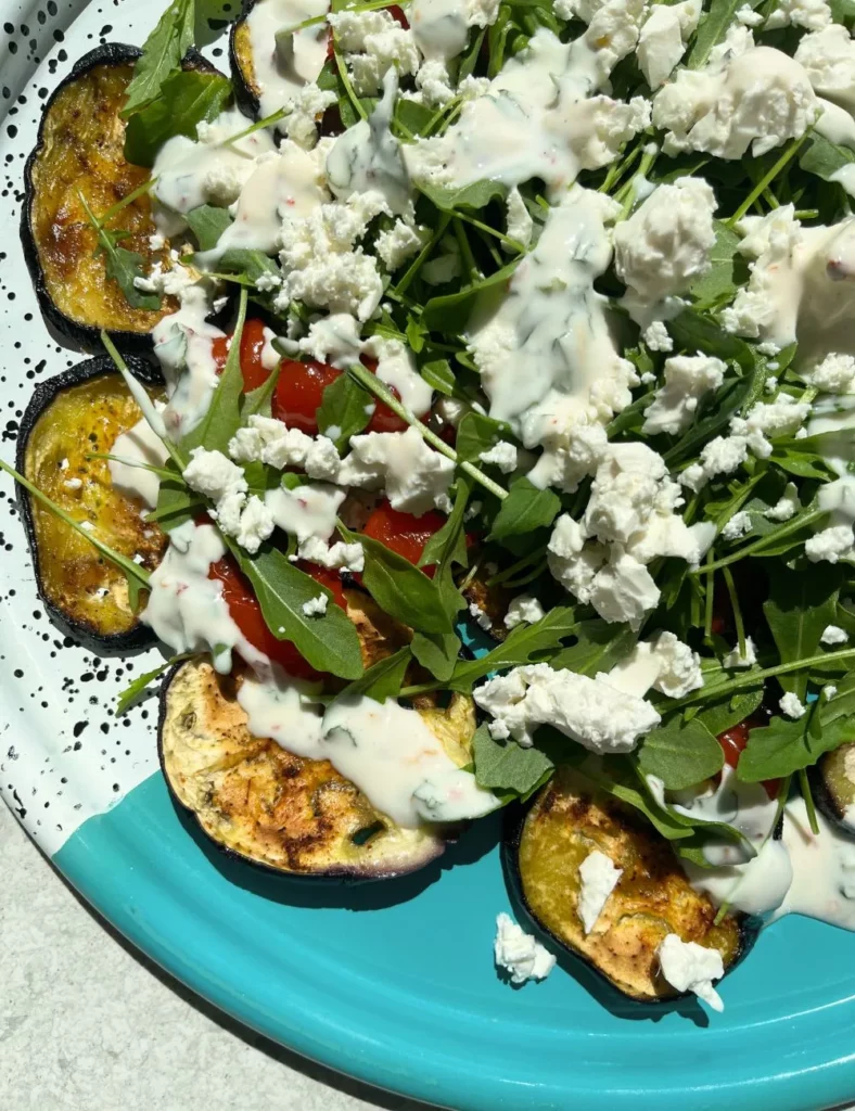 Upieczone warzywa przełóż na talerz (u mnie talerz emaliowany do pizzy), ułóż na nich rukolę i pokruszoną fetę. Całość polej sosem. Prawda, że proste? A jak wygląda!
