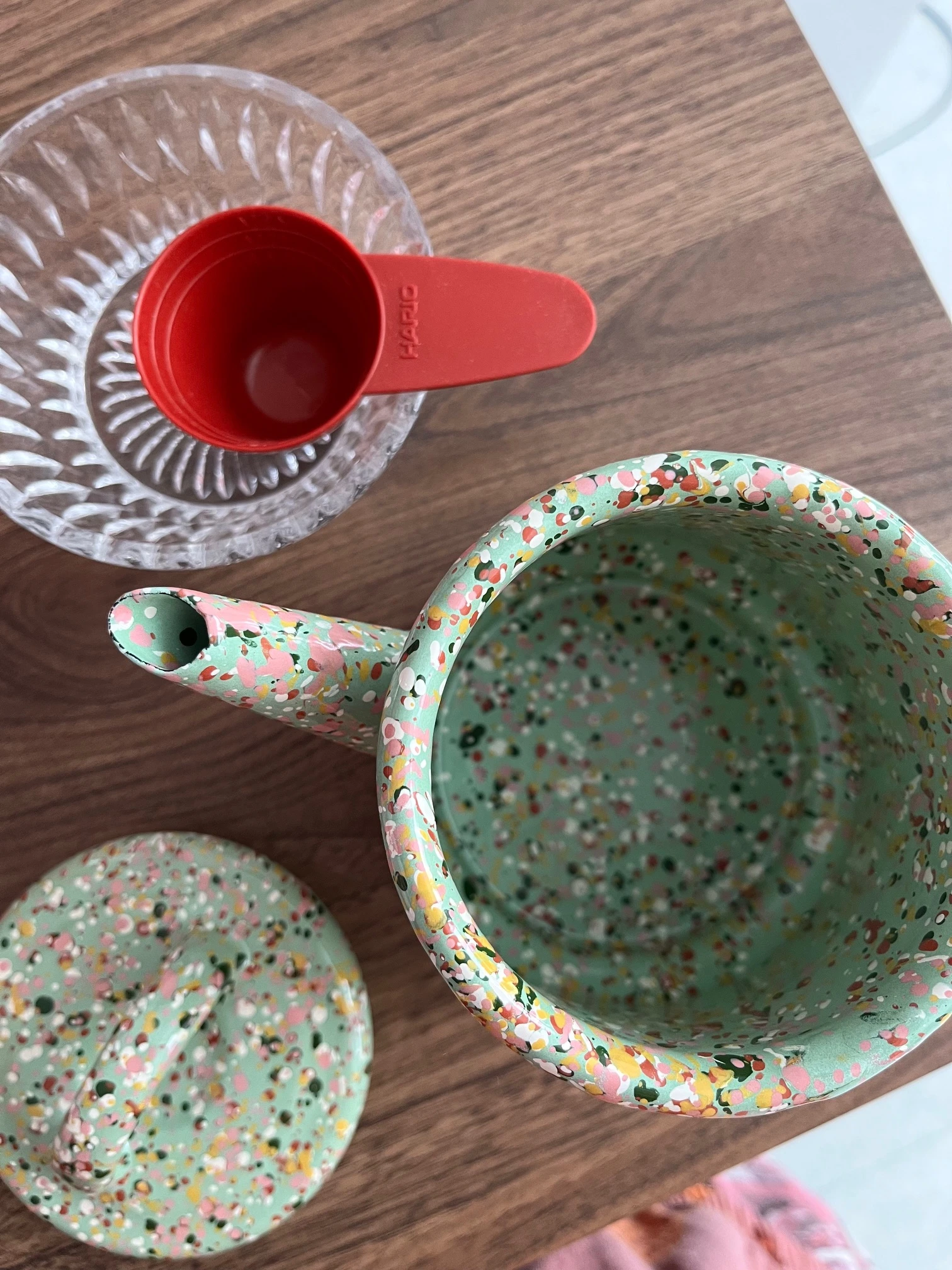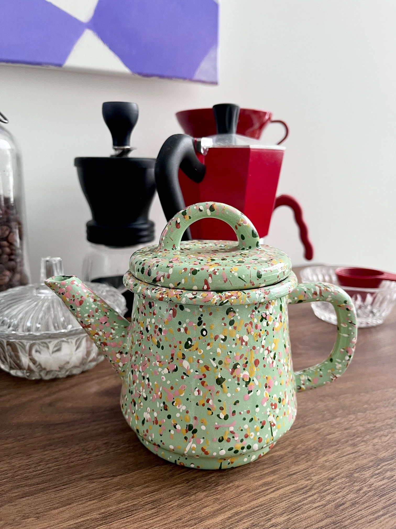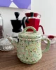 Miętowy czajniczek emaliowany ręcznie malowany z kolekcji Blush Meadow. Z przykrywką. Ma pojemność 500 ml. Solidny, trwały i pełen koloru, który nie blaknie w trakcie codziennego użytkowania. Można go bezpiecznie myć w zmywarce. Powierzchnia czajniczka jest jedwabiście gładka i nieporowata, dzięki czemu bardzo łatwo się go czyści. Nadaje się na wszystkie rodzaje kuchenek, również na indukcję. Można go używać na ogniu.