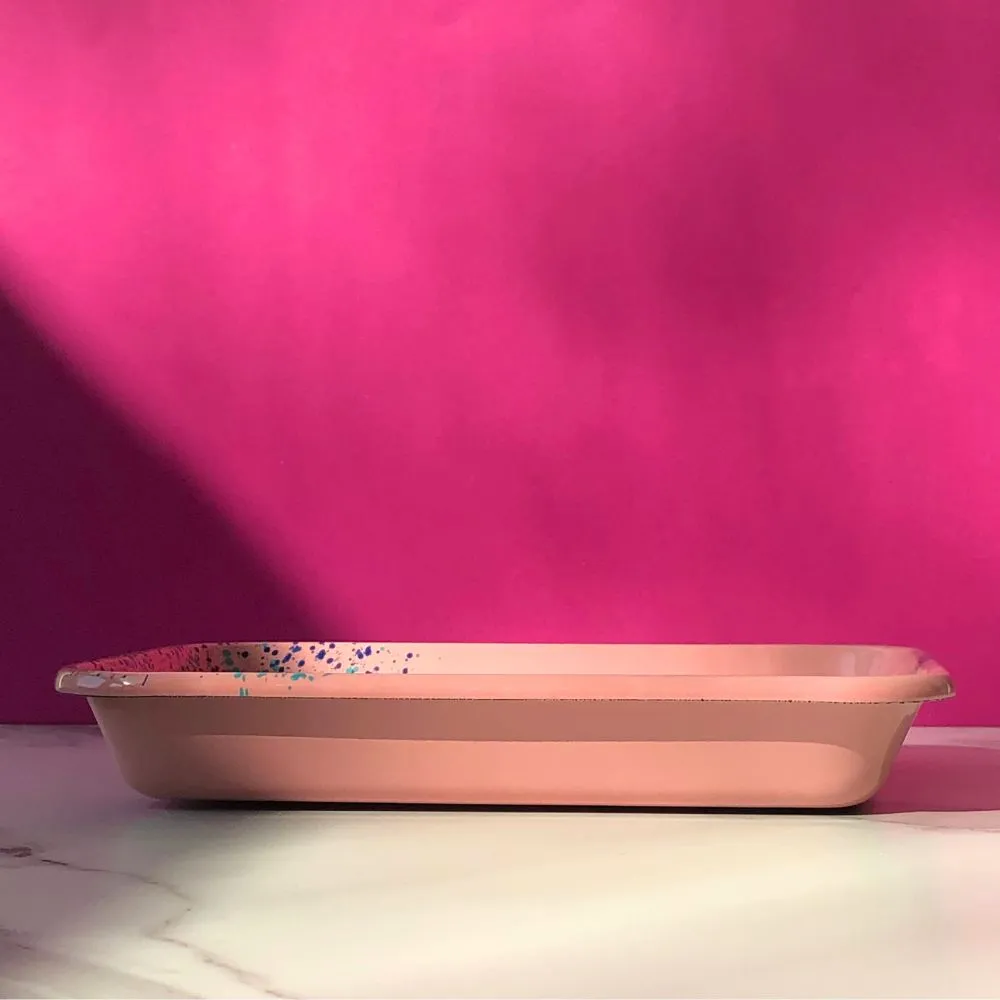 Forma do pieczenia emaliowana prostokątna różowa z kolekcji Flow Fest. Solidna, trwała, z mocno nasyconymi kolorami, które nie blakną w trakcie użytkowania. Formę można bezpiecznie myć w zmywarce. Nadaje się na wszystkie rodzaje kuchenek, również na indukcję. Można jej używać w piekarniku i na ogniu.