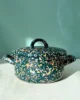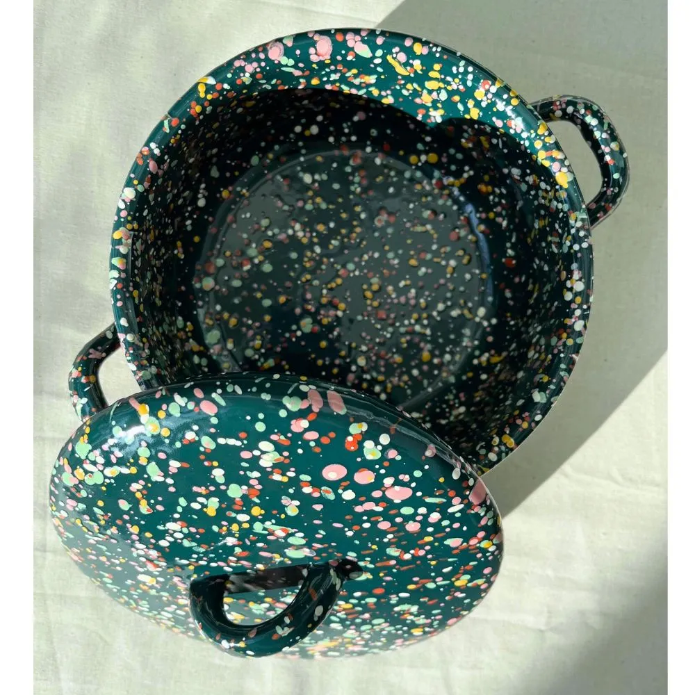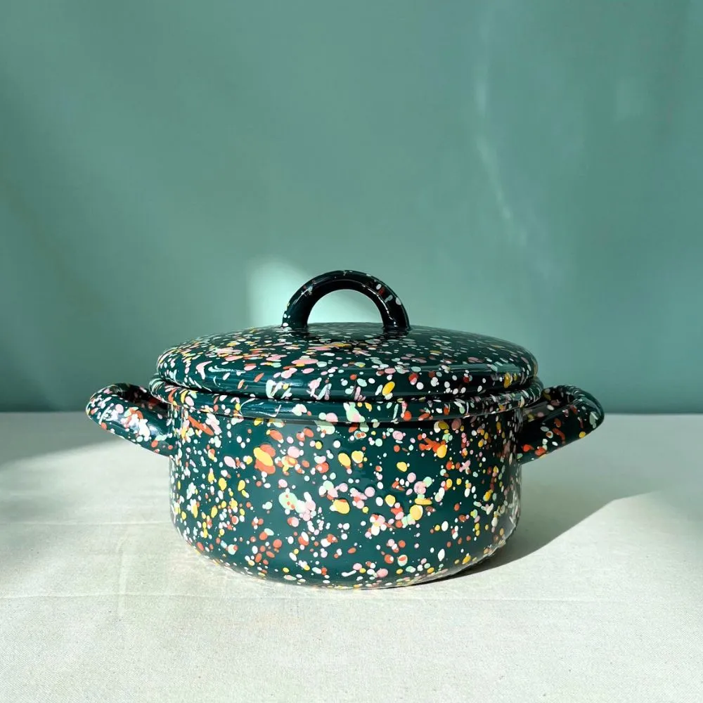 Garnek emaliowany z kolekcji Blush Meadow ciemnozielony w różnokolorowe kropki i plamki. Jego niewielki rozmiar i poręczny kształt sprawiają, że świetnie sprawdza się zarówno w codziennym użytkowaniu, jak i przy bardziej precyzyjnych kuchennych zadaniach. Solidny, trwały i pełen koloru, który nie blaknie w trakcie codziennego użytkowania. Można go bezpiecznie myć w zmywarce. Powierzchnia garnka jest jedwabiście gładka i nieporowata, dzięki czemu bardzo łatwo się ją czyści – nawet przypalone miejsca odchodzą bez szorowania. Nadaje się na wszystkie rodzaje kuchenek, również na indukcję. Można go używać w piekarniku do 250 °C i na ogniu.