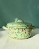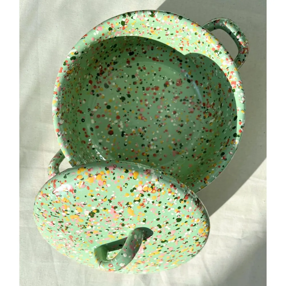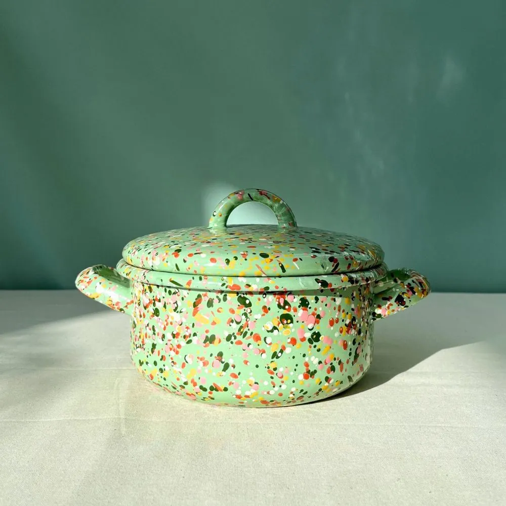 Garnek emaliowany z kolekcji Blush Meadow miętowy w różnokolorowe kropki i plamki. Jego niewielki rozmiar i poręczny kształt sprawiają, że świetnie sprawdza się zarówno w codziennym użytkowaniu, jak i przy bardziej precyzyjnych kuchennych zadaniach. Solidny, trwały i pełen koloru, który nie blaknie w trakcie codziennego użytkowania. Można go bezpiecznie myć w zmywarce. Powierzchnia garnka jest jedwabiście gładka i nieporowata, dzięki czemu bardzo łatwo się ją czyści – nawet przypalone miejsca odchodzą bez szorowania. Nadaje się na wszystkie rodzaje kuchenek, również na indukcję. Można go używać w piekarniku do 250 °C i na ogniu.