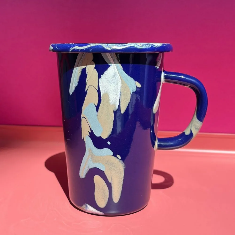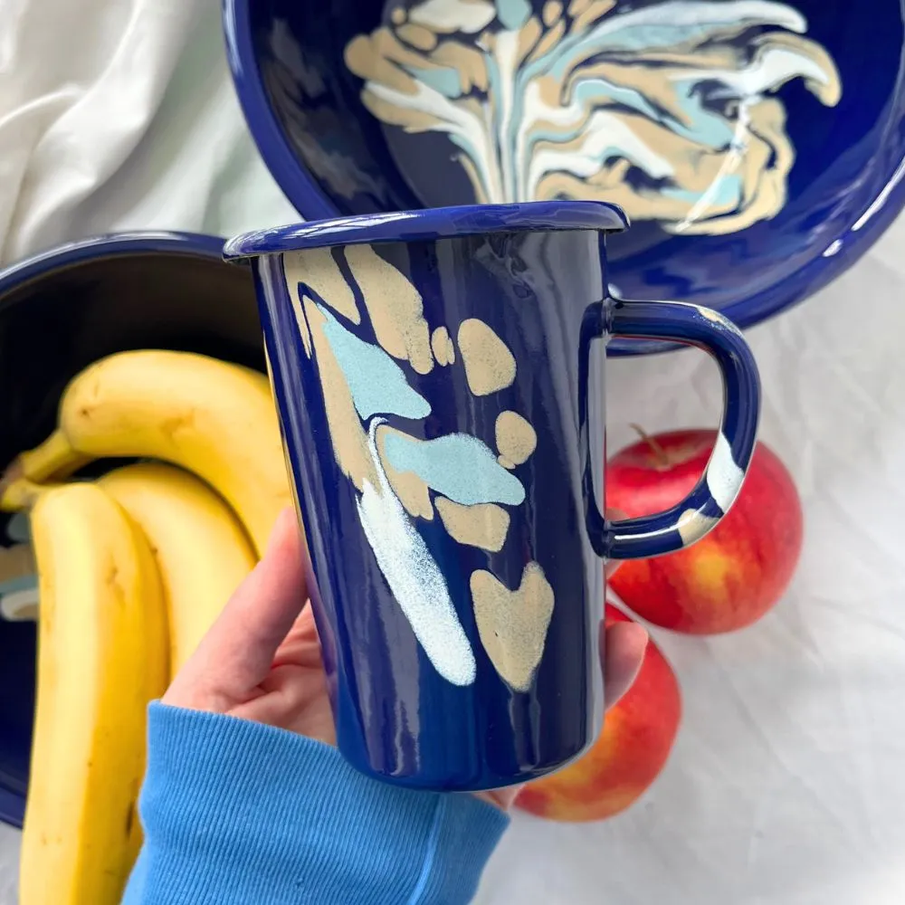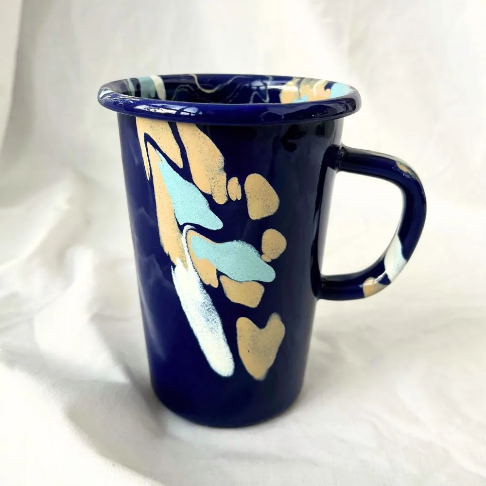 Granatowy kubek emaliowany z kolekcji Baltic Breeze. Solidny, trwały i pełen koloru, który nie blaknie w trakcie codziennego użytkowania. Można go bezpiecznie myć w zmywarce. Powierzchnia kubka jest jedwabiście gładka i nieporowata, dzięki czemu bardzo łatwo się go czyści. Nadaje się na wszystkie rodzaje kuchenek, również na indukcję. Można go używać w piekarniku do 250 °C i na ogniu.