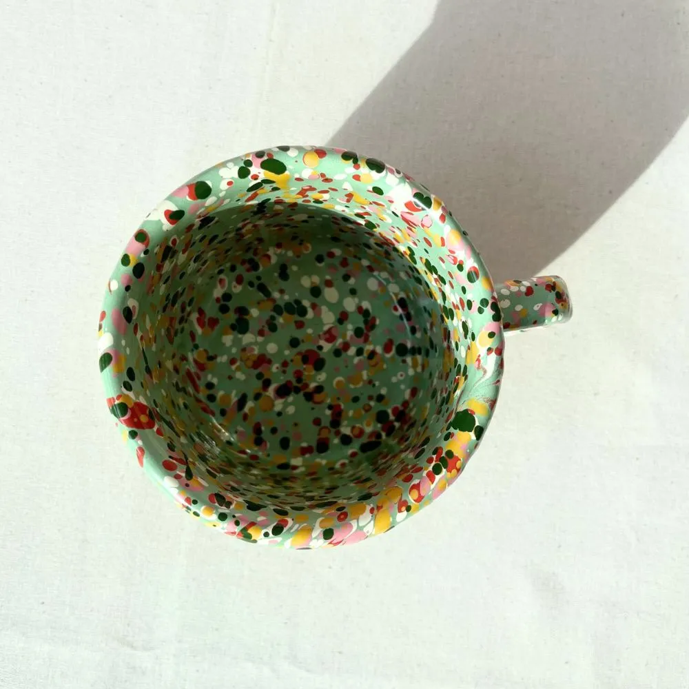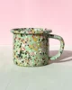 Miętowy kubek emaliowany z kolekcji Blush Meadow w wielobarwne kropki i plamki. Solidny, trwały i pełen koloru, który nie blaknie w trakcie codziennego użytkowania. Można go bezpiecznie myć w zmywarce. Powierzchnia kubka jest jedwabiście gładka i nieporowata, dzięki czemu bardzo łatwo się go czyści. Nadaje się na wszystkie rodzaje kuchenek, również na indukcję. Można go używać w piekarniku do 250 °C i na ogniu.
