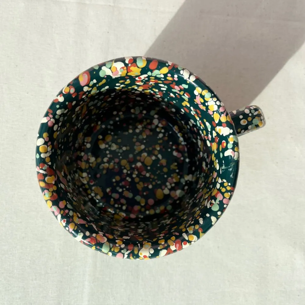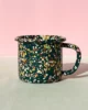 Ciemnozielony kubek emaliowany z kolekcji Blush Meadow w wielobarwne kropki i plamki. Solidny, trwały i pełen koloru, który nie blaknie w trakcie codziennego użytkowania. Można go bezpiecznie myć w zmywarce. Powierzchnia kubka jest jedwabiście gładka i nieporowata, dzięki czemu bardzo łatwo się go czyści. Nadaje się na wszystkie rodzaje kuchenek, również na indukcję. Można go używać w piekarniku do 250 °C i na ogniu.