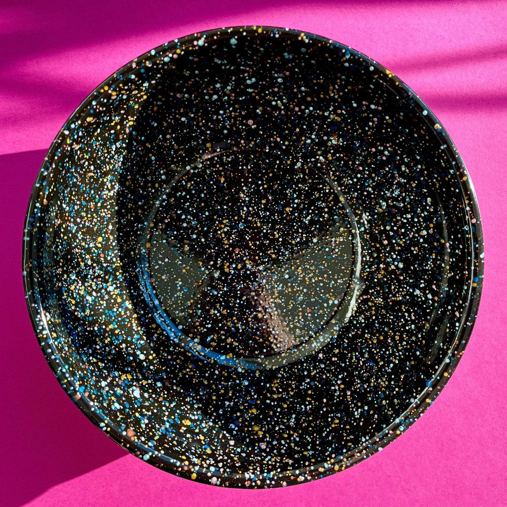 Duża czarna miska emaliowana z kolekcji Confetti w różnokolorowe kropeczki. Solidna, trwała i pełna koloru, który nie blaknie w trakcie codziennego użytkowania. Można ją bezpiecznie myć w zmywarce. Powierzchnia miski jest jedwabiście gładka i nieporowata, dzięki czemu bardzo łatwo się ją czyści – nawet przypalone miejsca odchodzą bez szorowania. Nadaje się na wszystkie rodzaje kuchenek, również na indukcję. Można jej używać w piekarniku do 250 °C i na ogniu.