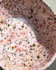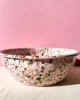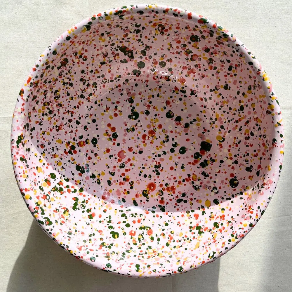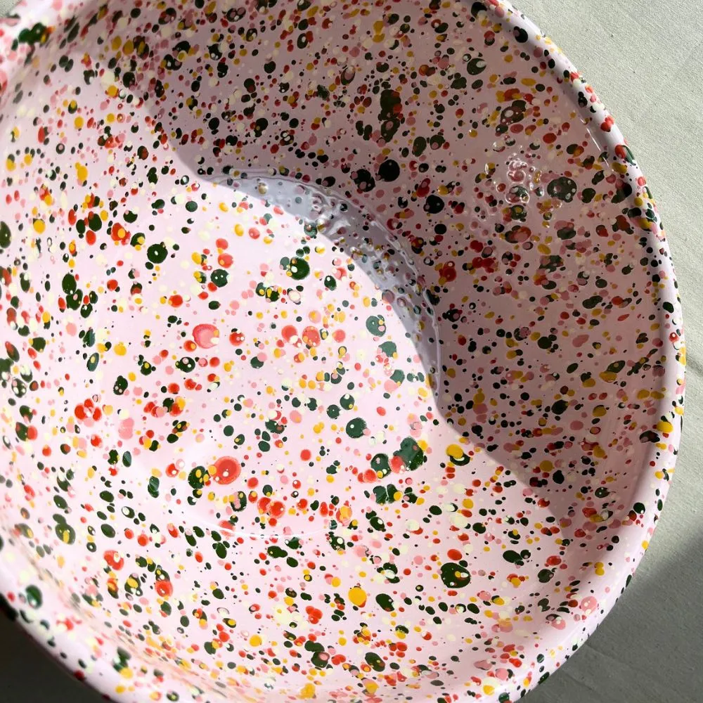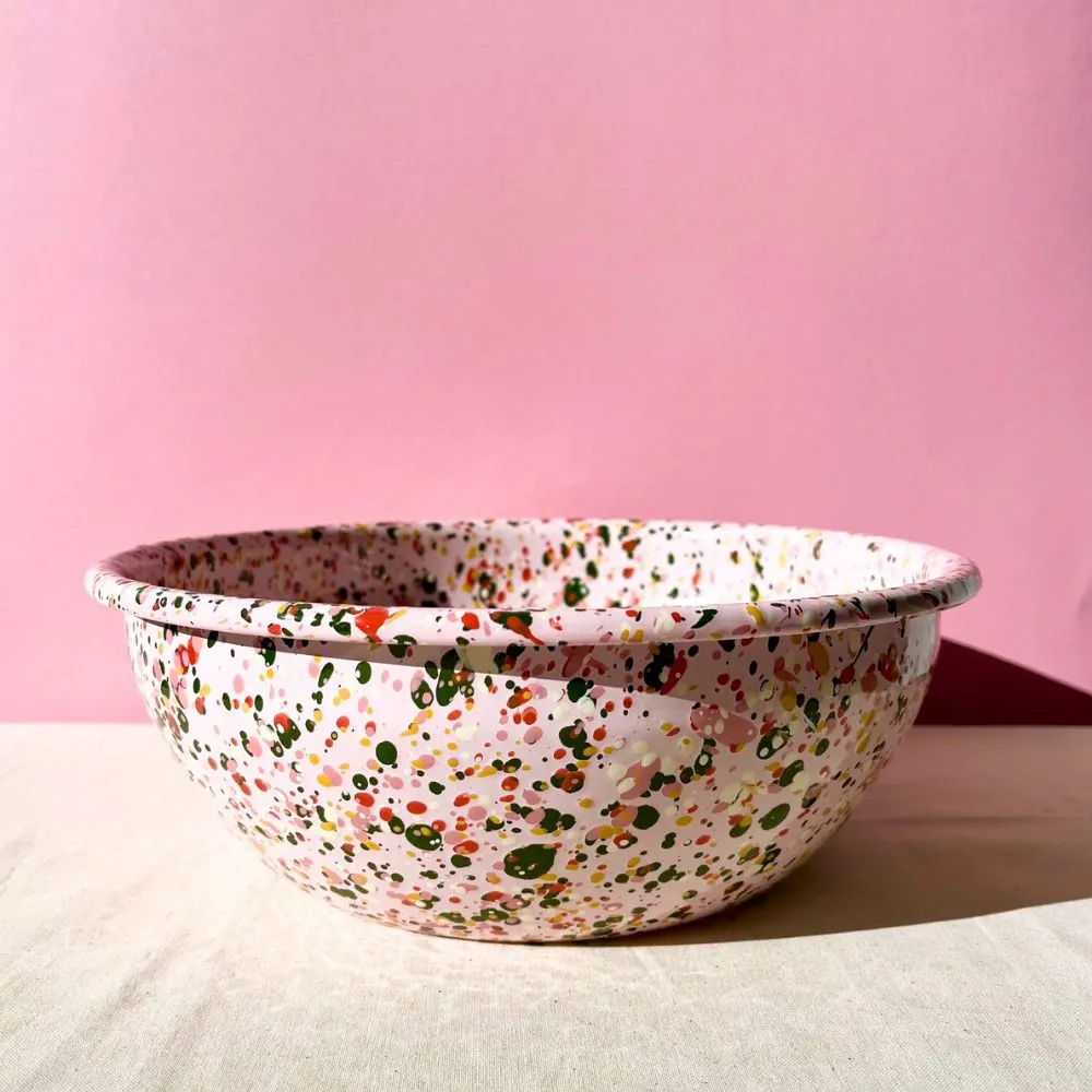 Duża różowa miska emaliowana z kolekcji Blush Meadow w wielobarwne kropki i plamki. Solidna, trwała i pełna koloru, który nie blaknie w trakcie codziennego użytkowania. Można ją bezpiecznie myć w zmywarce. Powierzchnia miski jest jedwabiście gładka i nieporowata, dzięki czemu bardzo łatwo się ją czyści – nawet przypalone miejsca odchodzą bez szorowania. Nadaje się na wszystkie rodzaje kuchenek, również na indukcję. Można jej używać w piekarniku do 250 °C i na ogniu.
