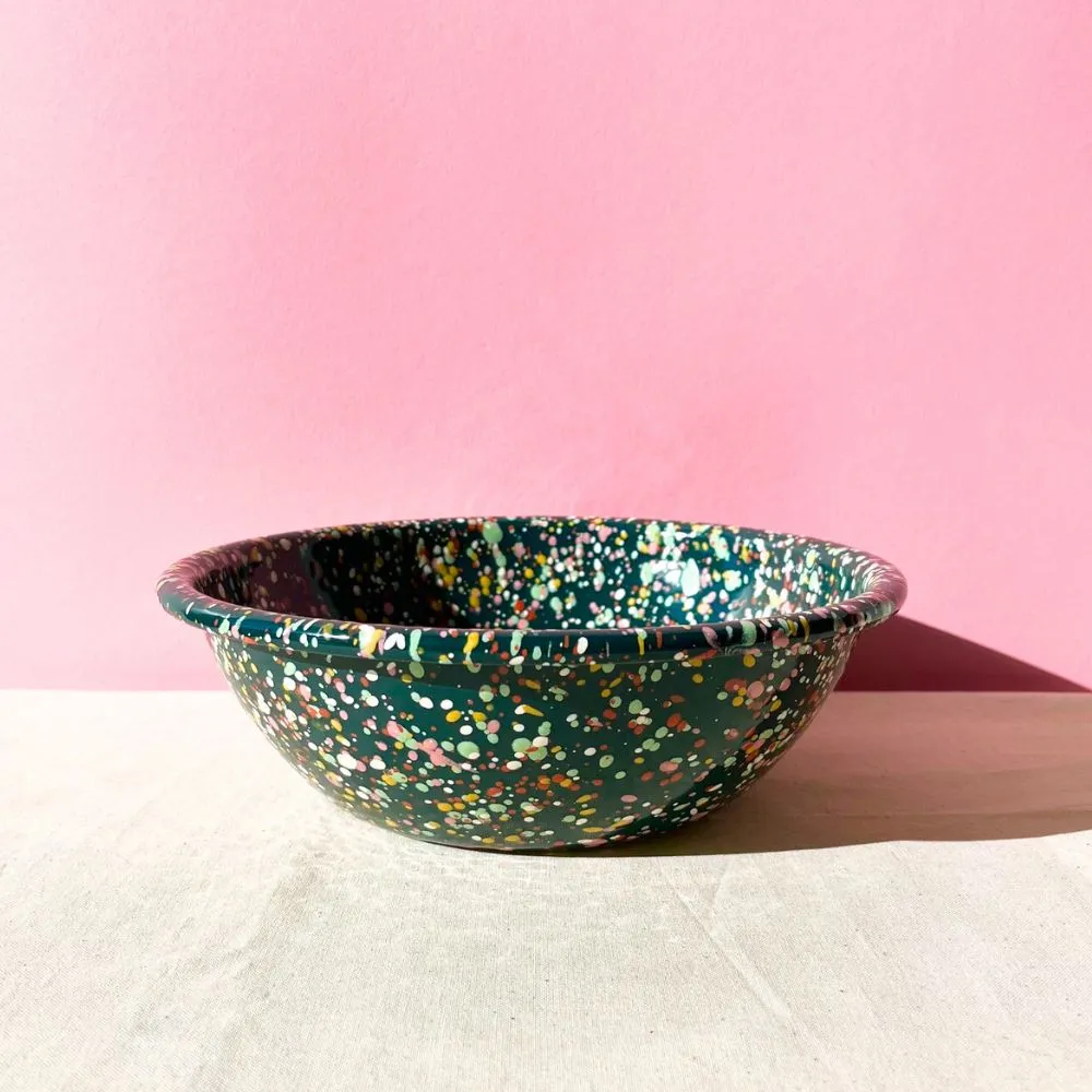 Ciemnozielona miska emaliowana ręcznie malowana z kolekcji Blush Meadow. Solidna, trwała i pełna koloru, który nie blaknie w trakcie codziennego użytkowania. Można ją bezpiecznie myć w zmywarce. Powierzchnia miski jest jedwabiście gładka i nieporowata, dzięki czemu bardzo łatwo się ją czyści – nawet przypalone miejsca odchodzą bez szorowania. Nadaje się na wszystkie rodzaje kuchenek, również na indukcję. Można jej używać w piekarniku do 250 °C i na ogniu.