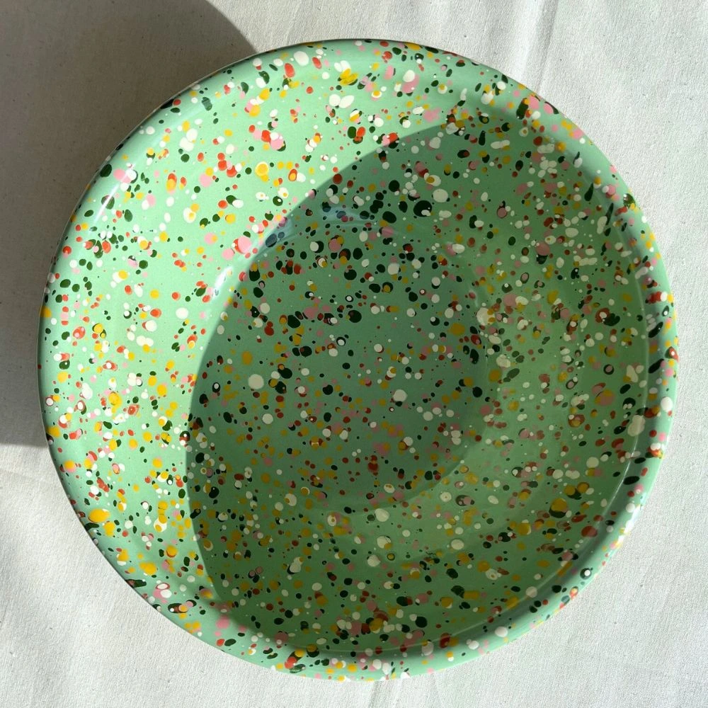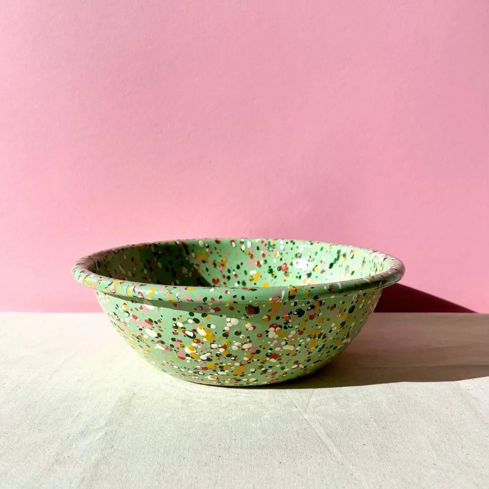 Miętowa miska emaliowana ręcznie malowana z kolekcji Blush Meadow. Solidna, trwała i pełna koloru, który nie blaknie w trakcie codziennego użytkowania. Można ją bezpiecznie myć w zmywarce. Powierzchnia miski jest jedwabiście gładka i nieporowata, dzięki czemu bardzo łatwo się ją czyści – nawet przypalone miejsca odchodzą bez szorowania. Nadaje się na wszystkie rodzaje kuchenek, również na indukcję. Można jej używać w piekarniku do 250 °C i na ogniu.