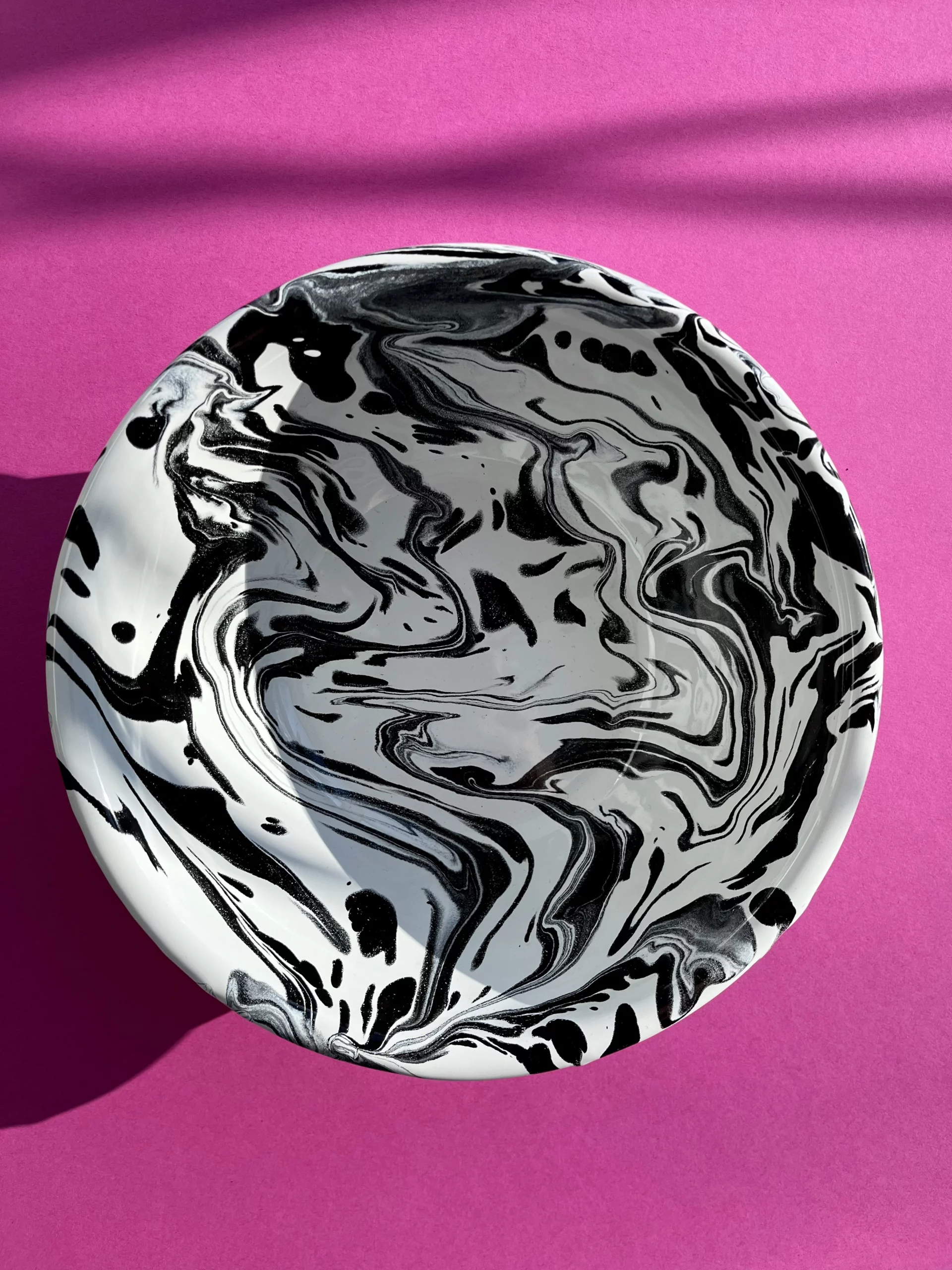 Czarno-biała miska emaliowana Marble ręcznie malowana w marmurkowy wzór. Solidna, trwała i pełna koloru, który nie blaknie w trakcie codziennego użytkowania. Można ją bezpiecznie myć w zmywarce. Powierzchnia miski jest jedwabiście gładka i nieporowata, dzięki czemu bardzo łatwo się ją czyści – nawet przypalone miejsca odchodzą bez szorowania. Nadaje się na wszystkie rodzaje kuchenek, również na indukcję. Można jej używać w piekarniku do 250 °C i na ogniu.
