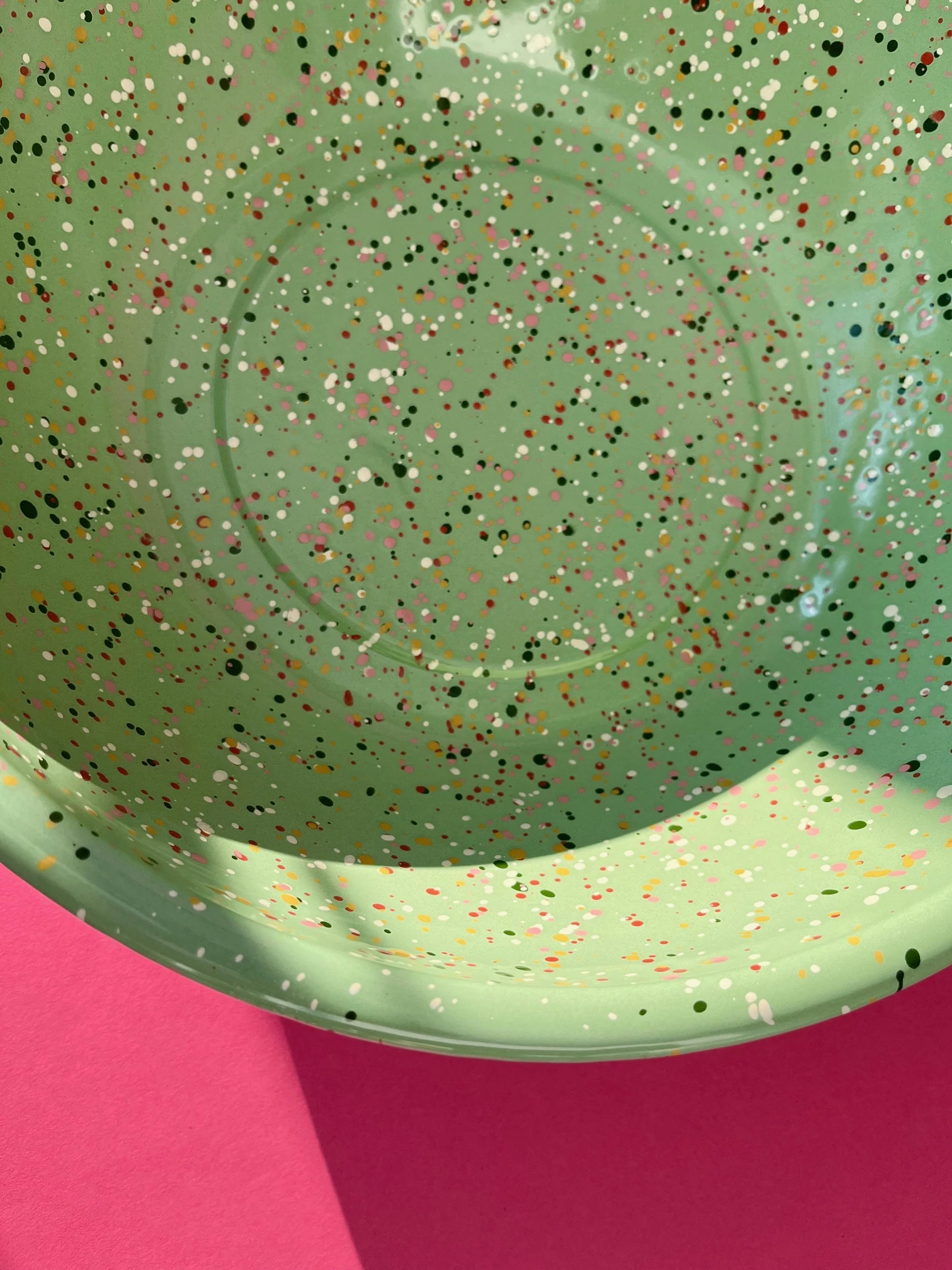 Duża miętowa miska emaliowana z kolekcji Blush Meadow. Solidna, trwała i pełna koloru, który nie blaknie w trakcie codziennego użytkowania. Można ją bezpiecznie myć w zmywarce. Powierzchnia miski jest jedwabiście gładka i nieporowata, dzięki czemu bardzo łatwo się ją czyści – nawet przypalone miejsca odchodzą bez szorowania. Nadaje się na wszystkie rodzaje kuchenek, również na indukcję. Można jej używać w piekarniku do 250 °C i na ogniu.